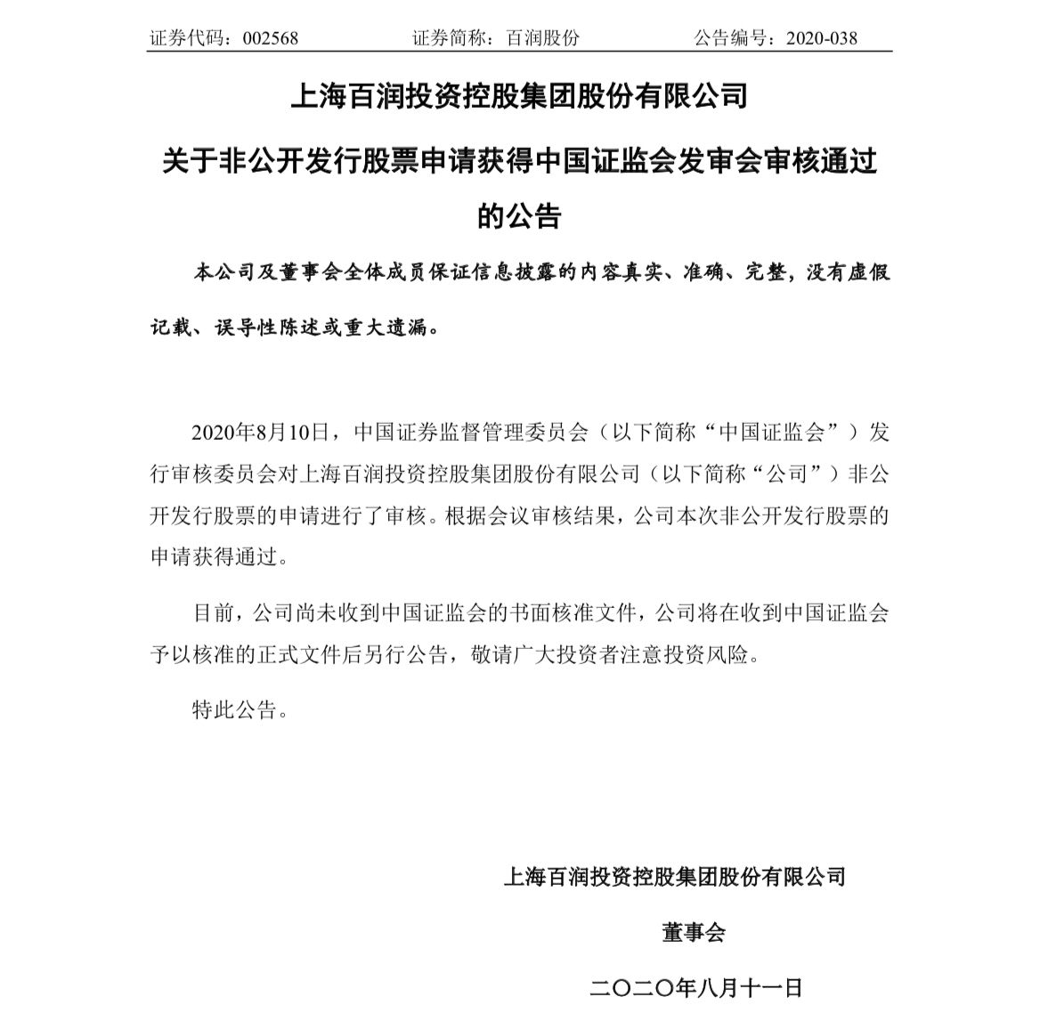 新京报讯(见习记者 赵方园)8 月11日,百润股份发布公告称,2020年8月10日,中国证监会发行审核委员会对公司非公开发行股票的申请进行了审核。根据会议审核结果,公司本次非公开发行股票的申请获得通过。