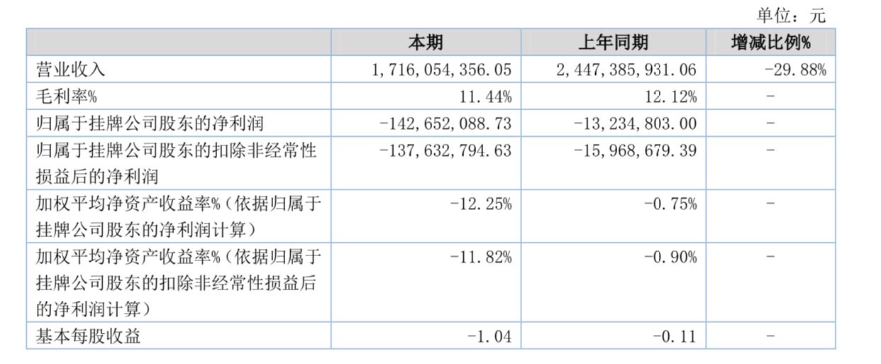 新京报讯(记者 薛晨)8月31日晚间,壹玖壹玖酒类平台科技股份有限公司(以下简称“1919”)发布2020年半年报。数据显示,上半年1919实现营业收入17.16亿元,同比下滑29.88%;归属于挂牌公司股东的净利润亏损额较去年同期扩大,由亏损1323.5万元,扩大至亏损1.43亿元。