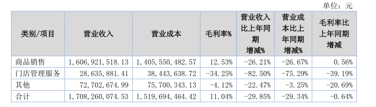 具体来看,1919上半年主营业务收入中商品销售收入16.07亿元,较上年同期下降5.7亿元,减幅26.21%;报告期合并净利润亏损更达到1.51亿元。