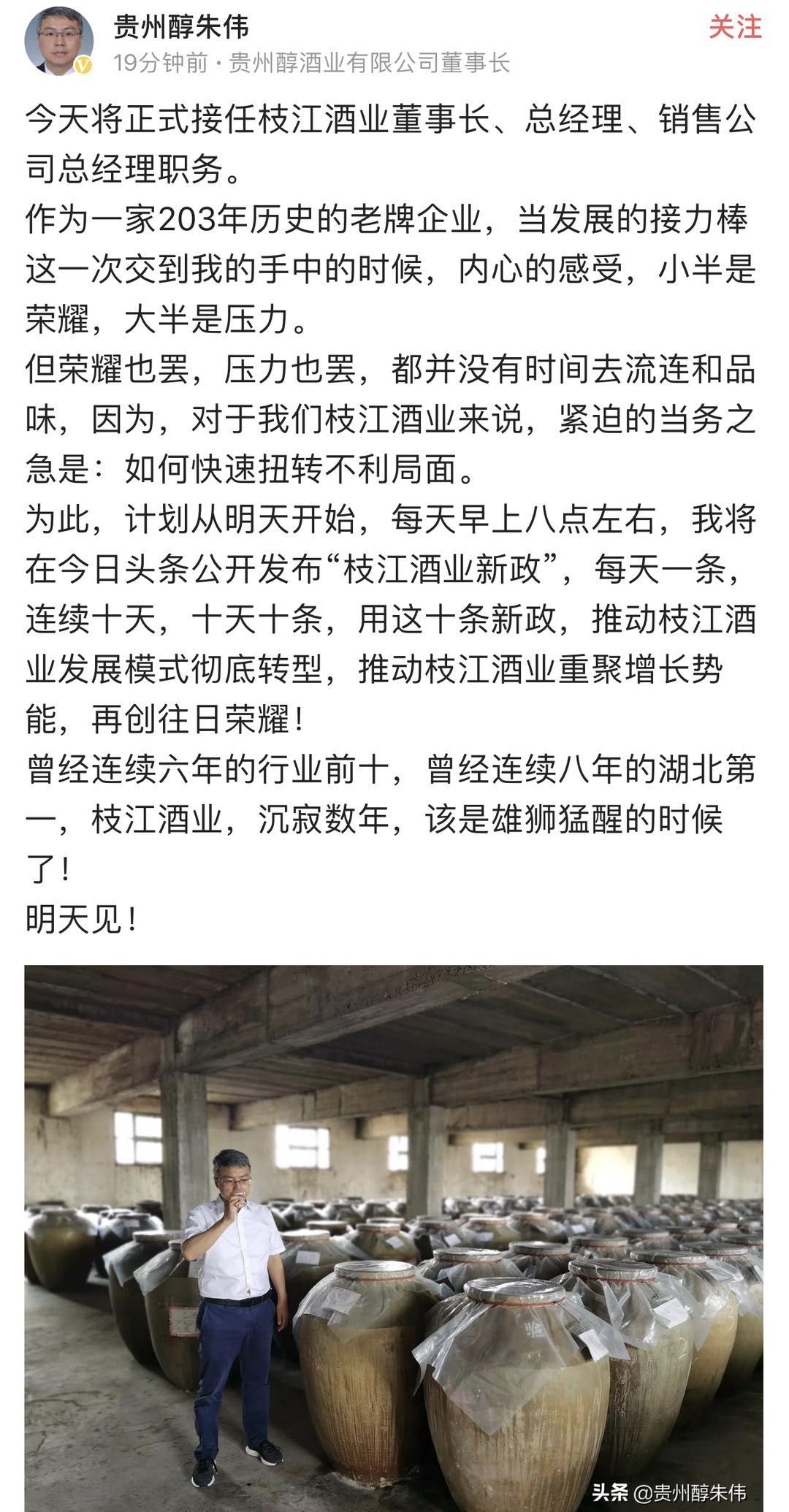 新京报讯(记者 薛晨)自江苏综艺集团宣布将枝江酒业纳入麾下时,便有业界观点猜测,贵州醇董事长朱伟将成为枝江酒业新的掌舵者,同时会将“真年份”概念引入这家湖北老牌酒企。9月1日,朱伟在其社交平台上正式就这一猜测作出肯定回答。朱伟表示,从今天开始,正式接任枝江酒业董事长、总经理、销售公司总经理职务。