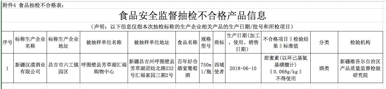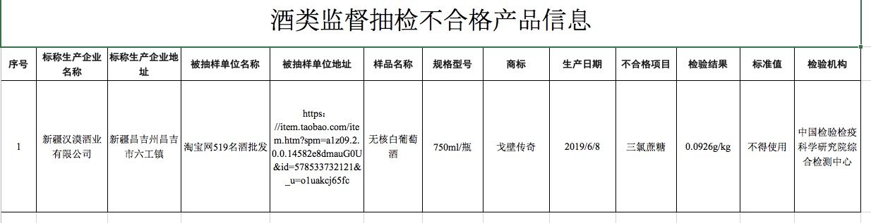 其中不合格酒类样品为,淘宝网519名酒批发(经营者为新疆维吾尔自治区乌鲁木齐市沙依巴克区阿勒泰路久酒源商行)在淘宝网(网店)销售的,标称新疆汉漠酒业有限公司生产的无核白葡萄酒,三氯蔗糖不符合食品安全国家标准规定。检验机构为中国检验检疫科学研究院综合检测中心。