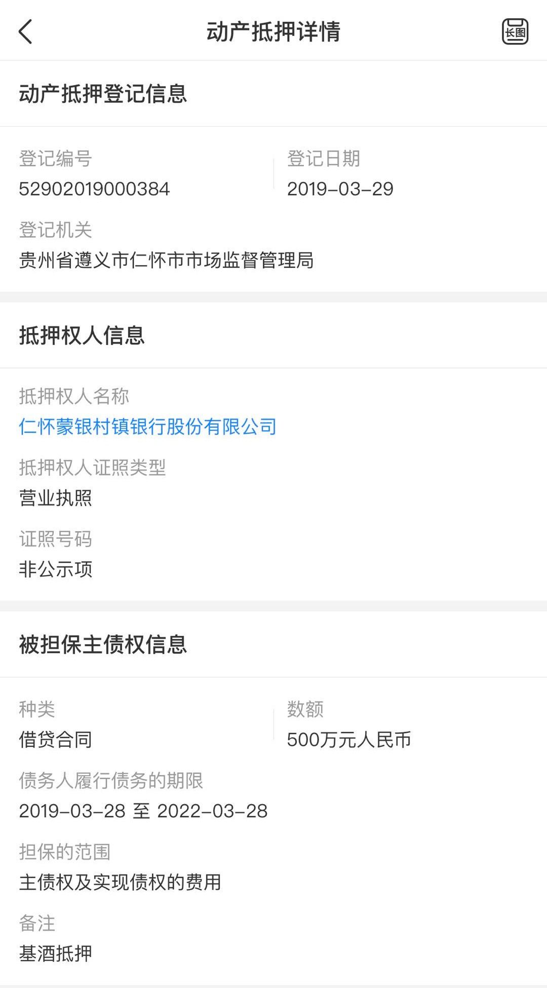 值得注意的是,此前,圣窖酒业曾两次以基酒抵押方式向仁怀蒙银村镇银行股份有限公司进行贷款,分别为2019年3月28日贷款500万元,2019年5月22日贷款480万元,履行债务期限均到2022年3月29日。
