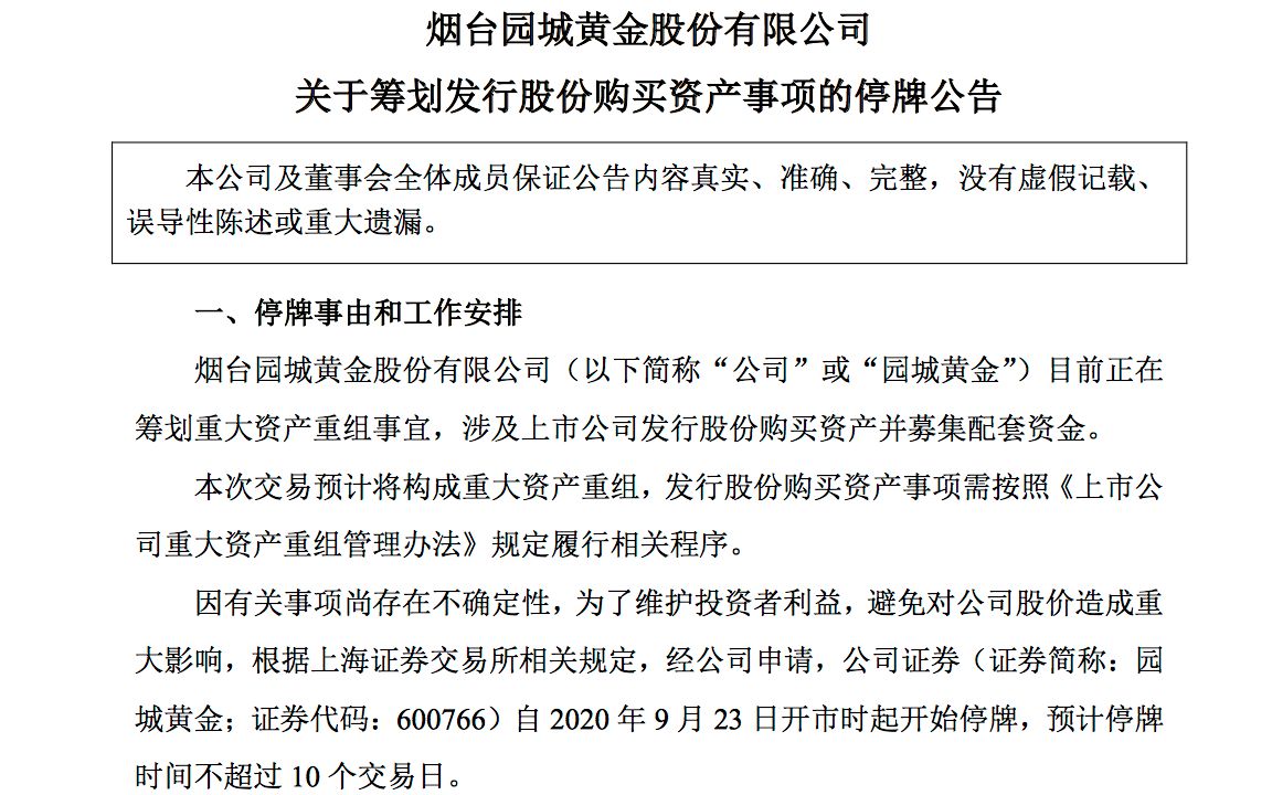 新京报讯(见习记者 赵方园)9月22日,烟台园城黄金股份有限公司(以下简称:“园城黄金”)发布公告称,公司拟收购贵州茅台镇圣窖酒业股份有限公司(简称:“圣窖酒业”)100%股权。公司股票自2020年9月23日开市时起开始停牌,预计停牌时间不超过10个交易日。