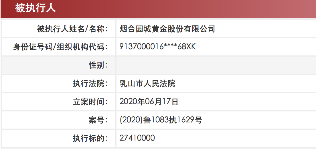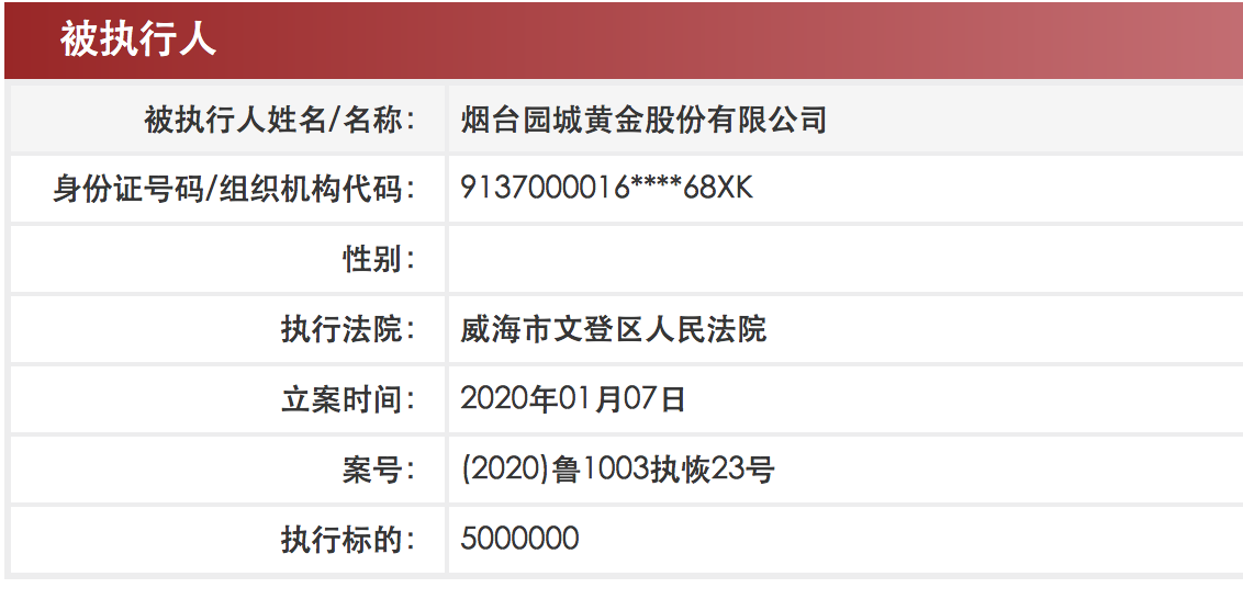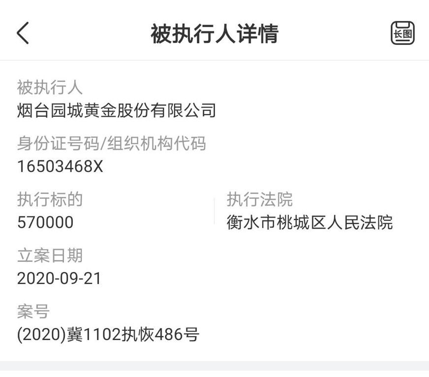 值得一提的是,在中国执行信息公开网上,新京报记者还发现,园城黄金还因两起案件也被列为“被执行人”,分别是2020年1月7日,执行标的5000000,执行法院为威海市文登区人民法院;2020年6月17日,执行标的27410000,执行法院为旅山市人民法院。对此,园城黄金董秘办工作人员解释,这两起案件均为公司股东园城集团的借款,已和法院沟通。