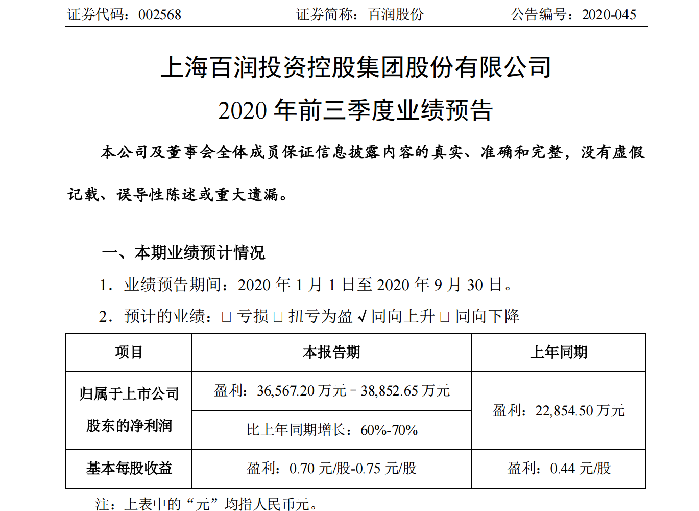新京报讯(记者 郑明珠)9月24日,百润股份发布2020年前三季度业绩预告,预计前三季度,归属于上市公司股东的净利润3.66亿元至3.89亿元,比上年同期增长60%至70%,基本每股收益盈利0.70元至0.75元。