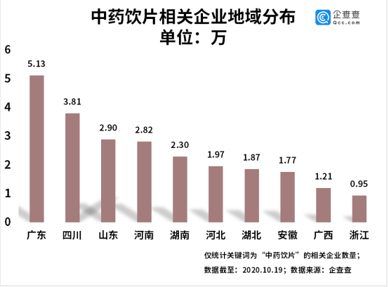 企查查数据显示,截至2020年10月,我国共有中药饮片相关企业41.42万家。从地域分布来看,广东省的中药饮片相关企业数量最多,达5.13万家,占比高达12.4%。四川省和湖南省的相关企业数量分别排第二和第三位,数量为3.81万家和2.30万家。