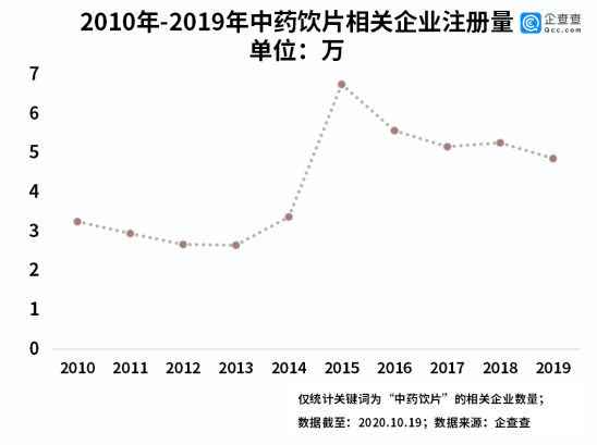 2010年以来的十年内,中药饮片相关企业年注册量呈现先增后减的变化趋势。企查查数据显示,2010年共注册相关企业3.25万家,2015年注册量达到了十年来的最高峰,共6.75万家,同比增长100%。2019年共注册相关企业4.86万家,同比减少7.6%。