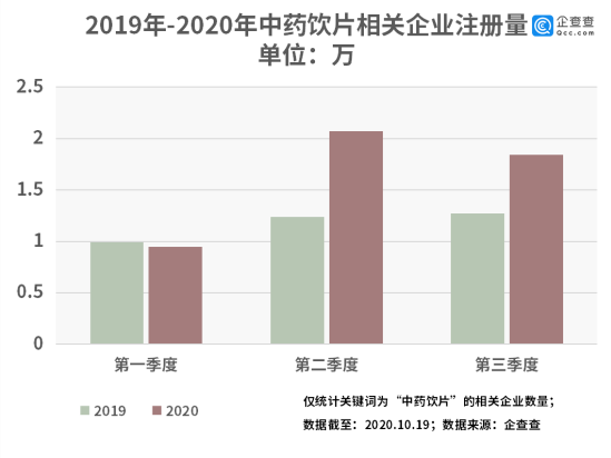 企查查数据显示,2020年前三季度共注册中药饮片相关企业4.86万家,同比增长38.9%。从季度来看,三季度共注册相关企业1.84万家,环比减少11.1%,同比增长44.9%。