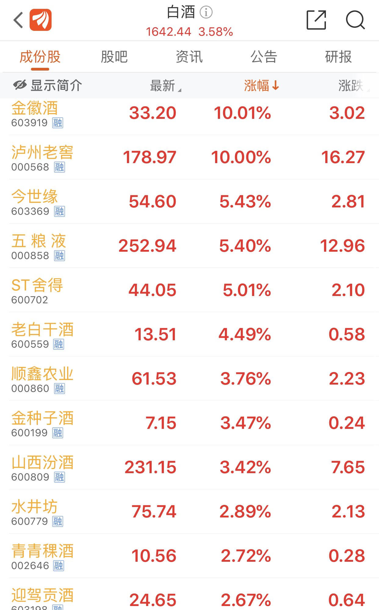 其中,泸州老窖、金徽酒、ST舍得涨停。截至29日上午,泸州老窖收于178.97元/股,金徽酒收于33.20元/股,股价均创新高。ST舍得收于44.05元/股。