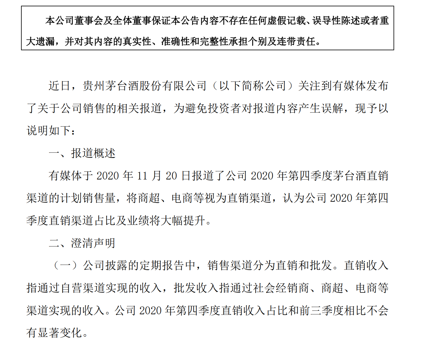 贵州茅台11月23日早间发布公告称,2020年第四季度直销收入占比和前三季度相比不会有显著变化。另外,2020年度实现营业总收入较上年度增长10%左右的目标未发生变化。