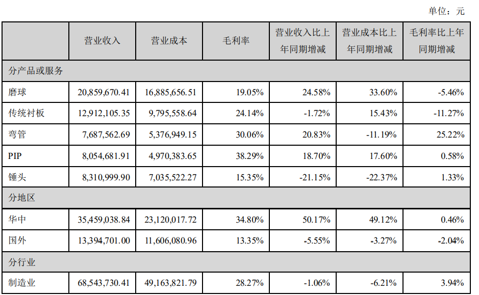 产品方面,以2020年上半年为例,华民股份合计实现营收约6854万元,其中,磨球、传统衬板、弯管、PIP和锤头分别实现收入约2086万元、1291万元、769万元、805万元和831万元。