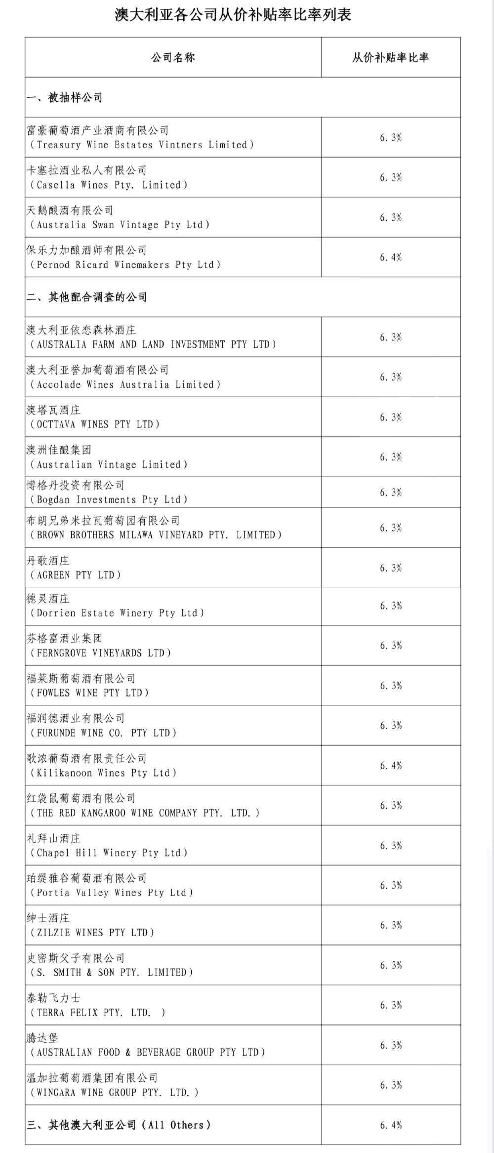 各公司临时反补贴税保证金比率为6.3%—6.4%。征收临时反补贴税保证金的方法为,自2020年12月11日起,进口经营者在进口原产于澳大利亚的相关葡萄酒时,应依据初裁决定所确定的各公司的从价补贴率向中华人民共和国海关提供相应的临时反补贴税保证金。临时反补贴税保证金以海关审定的完税价格从价计征。