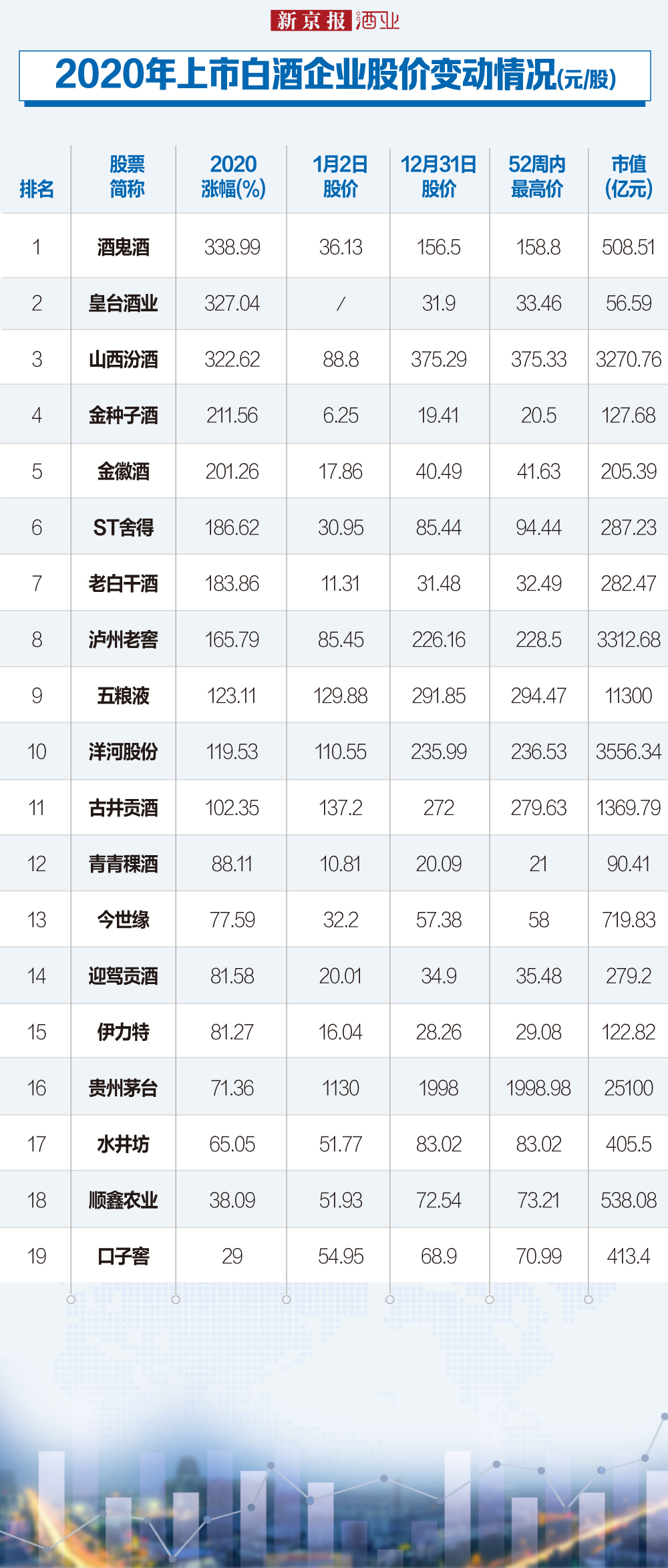 2020年,资本市场全年“醉酒”,酒鬼酒更是全年股价上涨高达338.99% ,领涨白酒股。