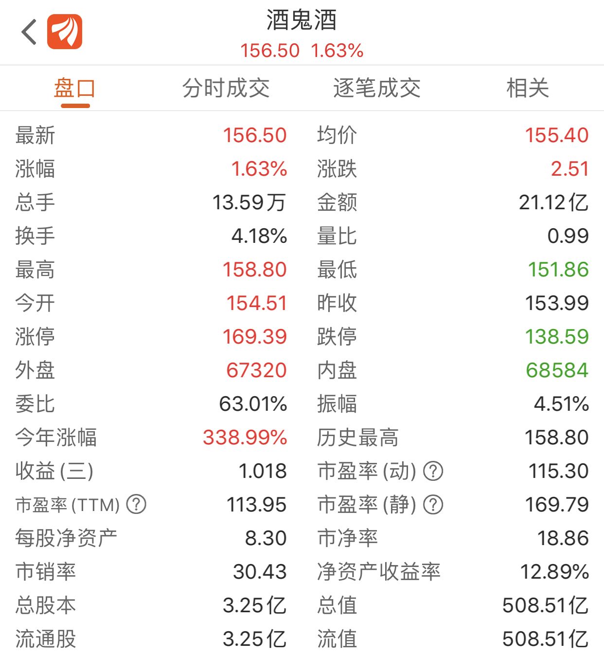 股价上涨最集中的月份为12月,21个交易日中共有16个交易日股价上涨。12月31日,酒鬼酒股价再次上涨,盘中最高达158.8元,截至当日收盘,酒鬼酒报156.5元/股,总市值达508.5亿元。