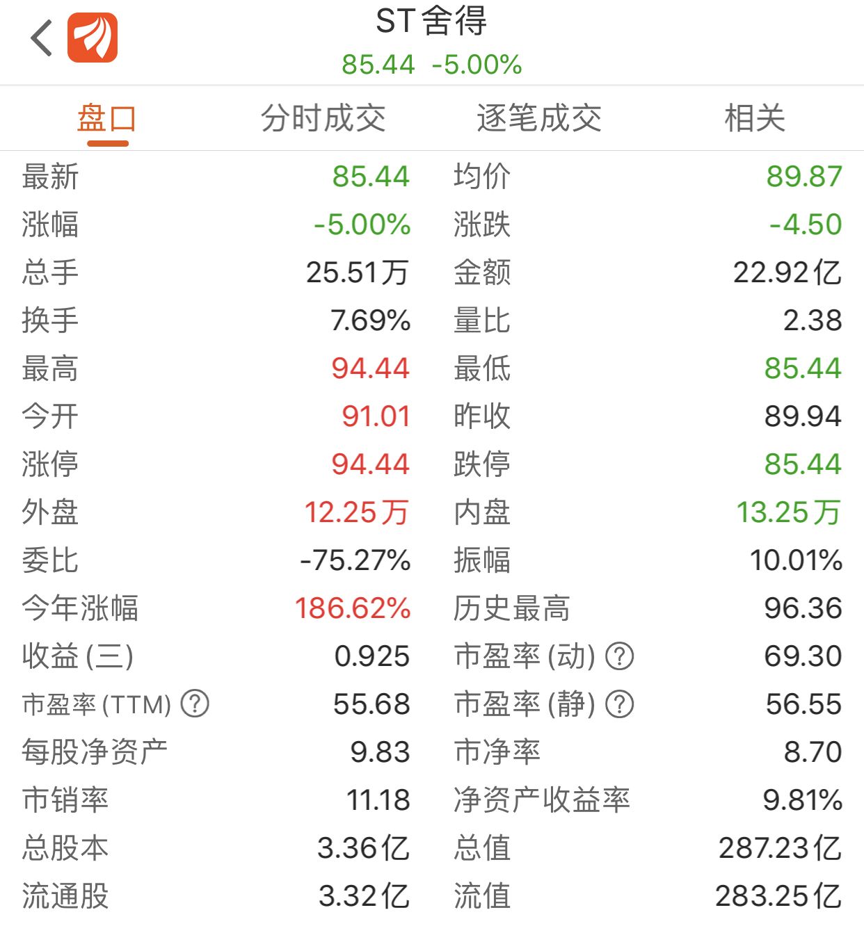 12月以来,ST舍得股价跌宕起伏,两次上演天地板。12月23日开盘,ST舍得涨停,股价收于96.36元,创下历史新高。不过,中午开盘后,ST舍得迅速跳水,股价一度触及跌停板,成交逾15亿元。截至收盘,封单高达2万手,股价报87.18元/股。12月24日,ST舍得再次跌停。12月31日,ST舍得再次上演天地板,报85.44元/股。