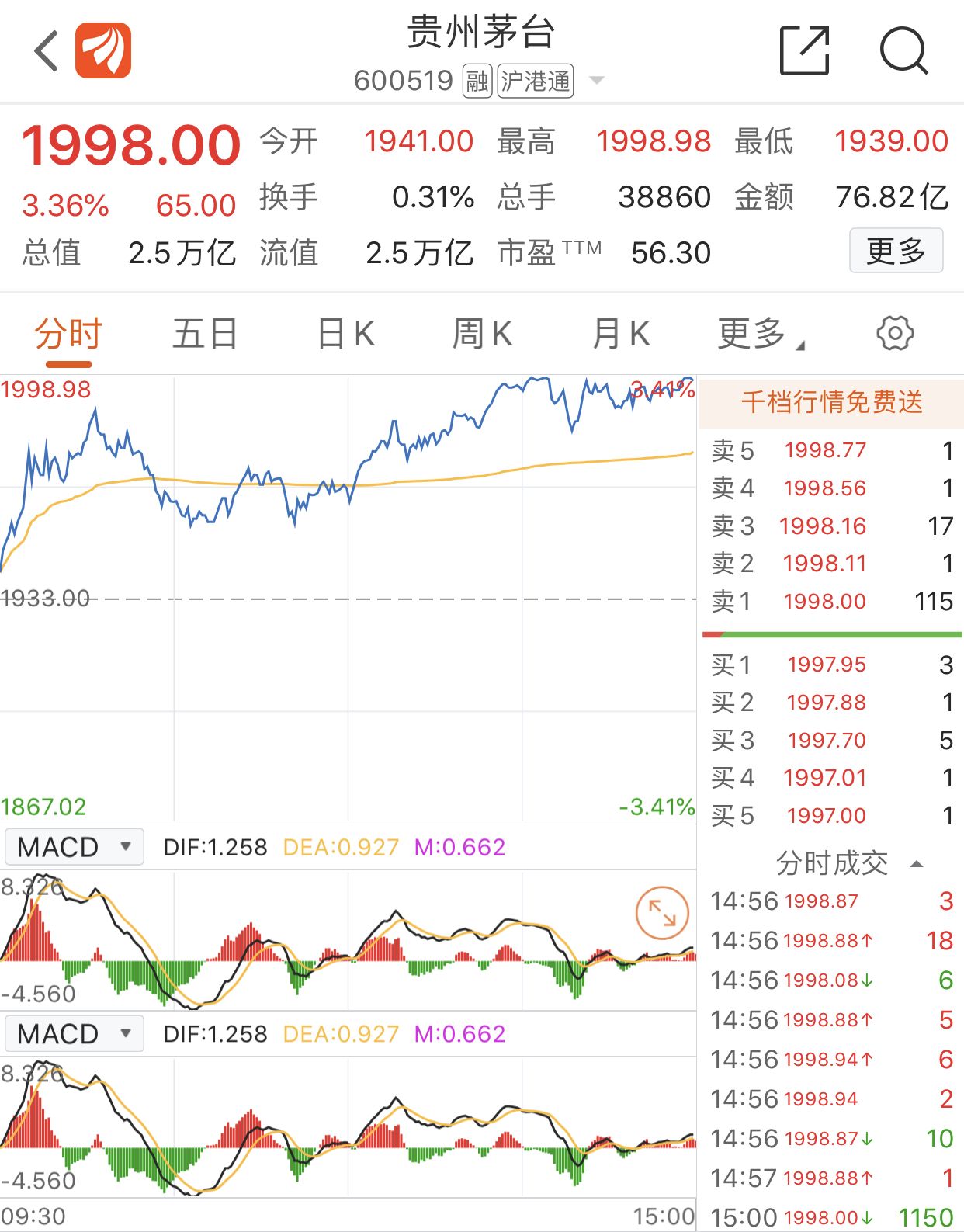 贵州茅台股价达1998元,总市值位居A股第一
