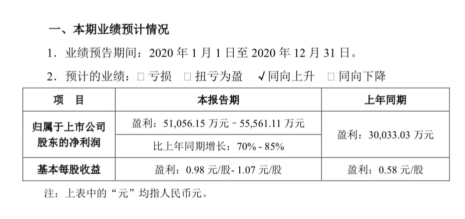 新京报快讯 (记者 郑明珠)1月15日,上海百润投资控股集团股份有限公司(以下简称“百润股份”)发布2020年度业绩预告称,预计2020年归属于上市公司股东的净利润为盈利5.11亿元–5.56亿元,比上年同期增长70% - 85%;基本每股收益盈利0.98 元 / 股 - 1.07 元 / 股。