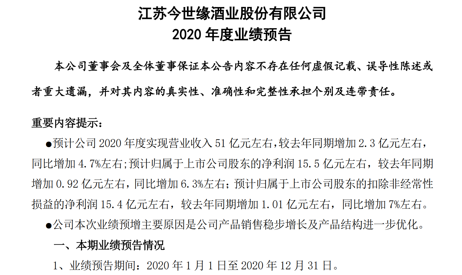 新京报快讯(记者 郑明珠)1月18日,江苏今世缘酒业股份有限公司(以下简称“今世缘”)发布2020年度业绩预告称,预计公司 2020 年度实现营业收入51亿元左右,较去年同期增加2.3亿元左右,同比增加4.7%左右。