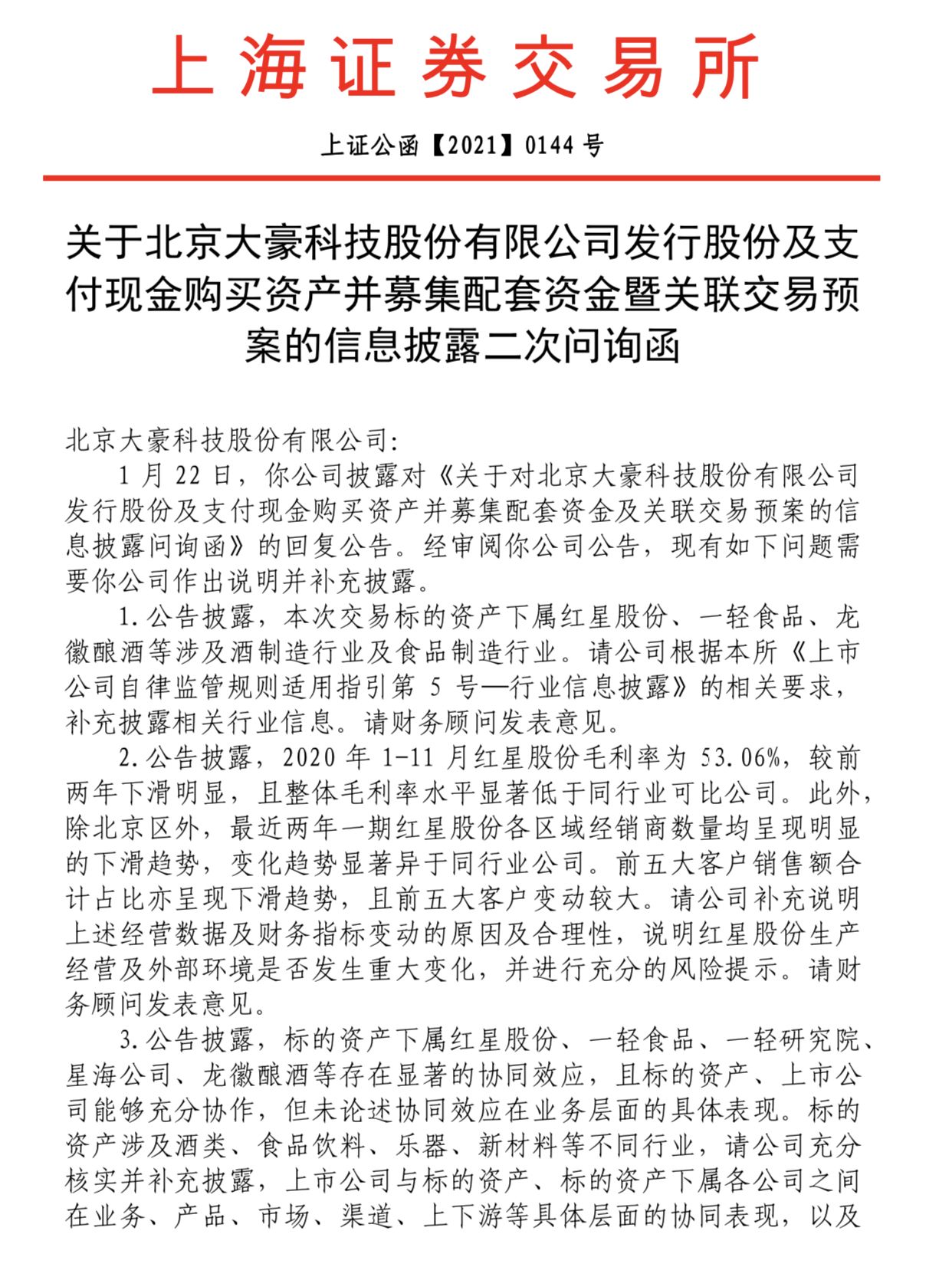 公告称,本次交易标的资产下属红星股份、一轻食品、龙徽酿酒等涉及酒制造行业及食品制造行业。上交所要求大豪科技根据相关要求,补充披露相关行业信息。