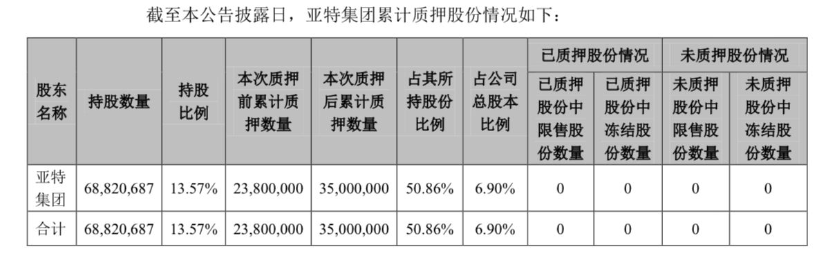 根据公告显示,此次质押的原因是为补充流动资金,质押时间为三年。截至本公告披露日,亚特集团持有公司股份68820687股,占公司总股本的13.57%。本次股份质押后,亚特集团累计质押公司股份35000000股,占其持有公司股份总数的50.86%,占公司总股本的6.90%。