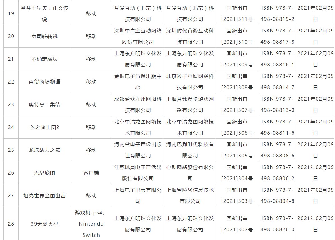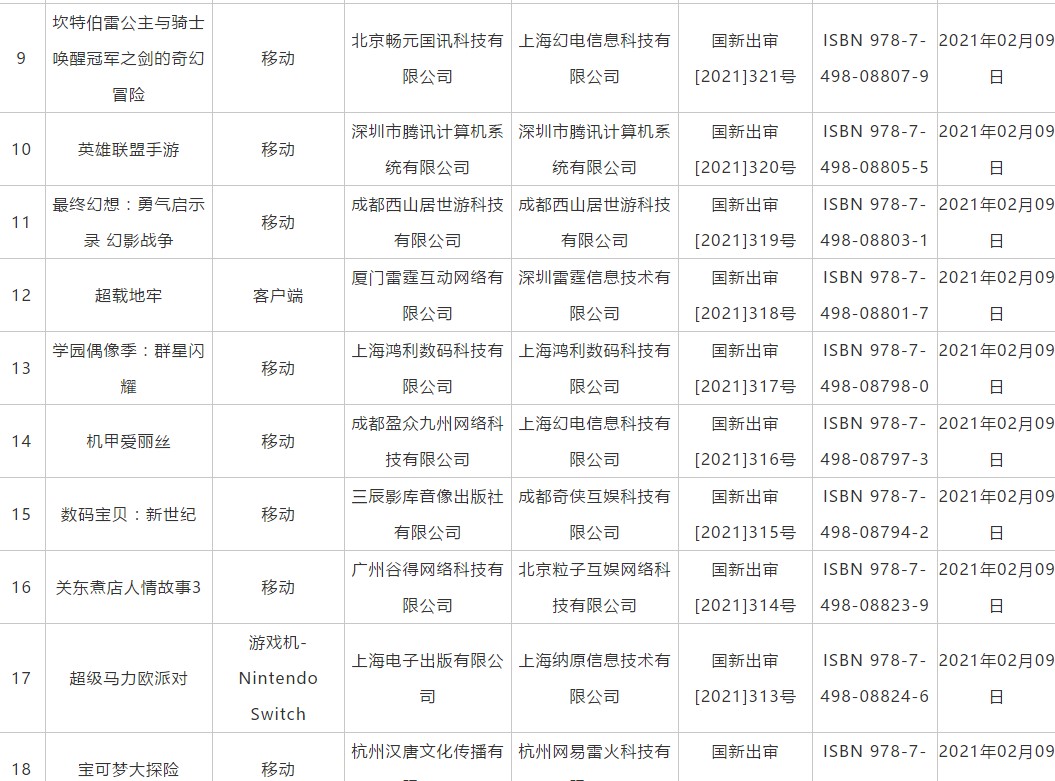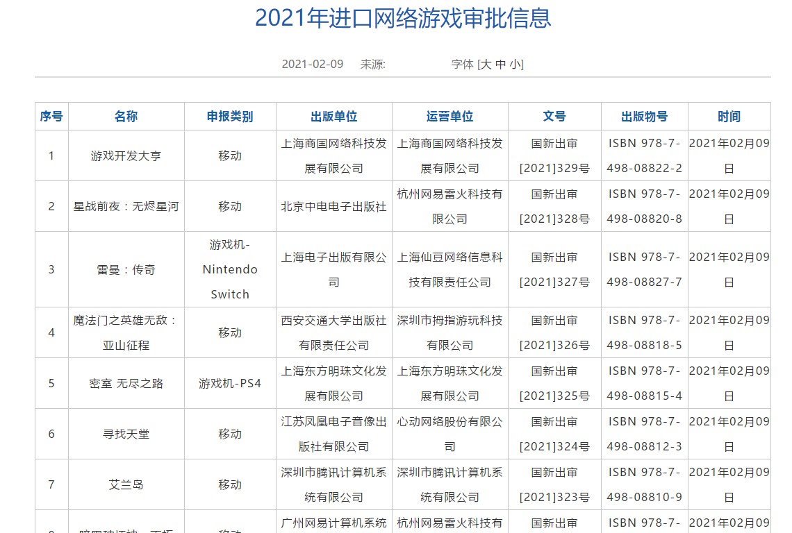 新京报贝壳财经讯 2月9日,国家新闻出版署官网公布2021年进口网络游戏审批信息,共33款游戏获批。在此次获批版号的游戏中,重点游戏包括《英雄联盟手游》、《超级马力欧派对》、《星战前夜:无烬星河》等。