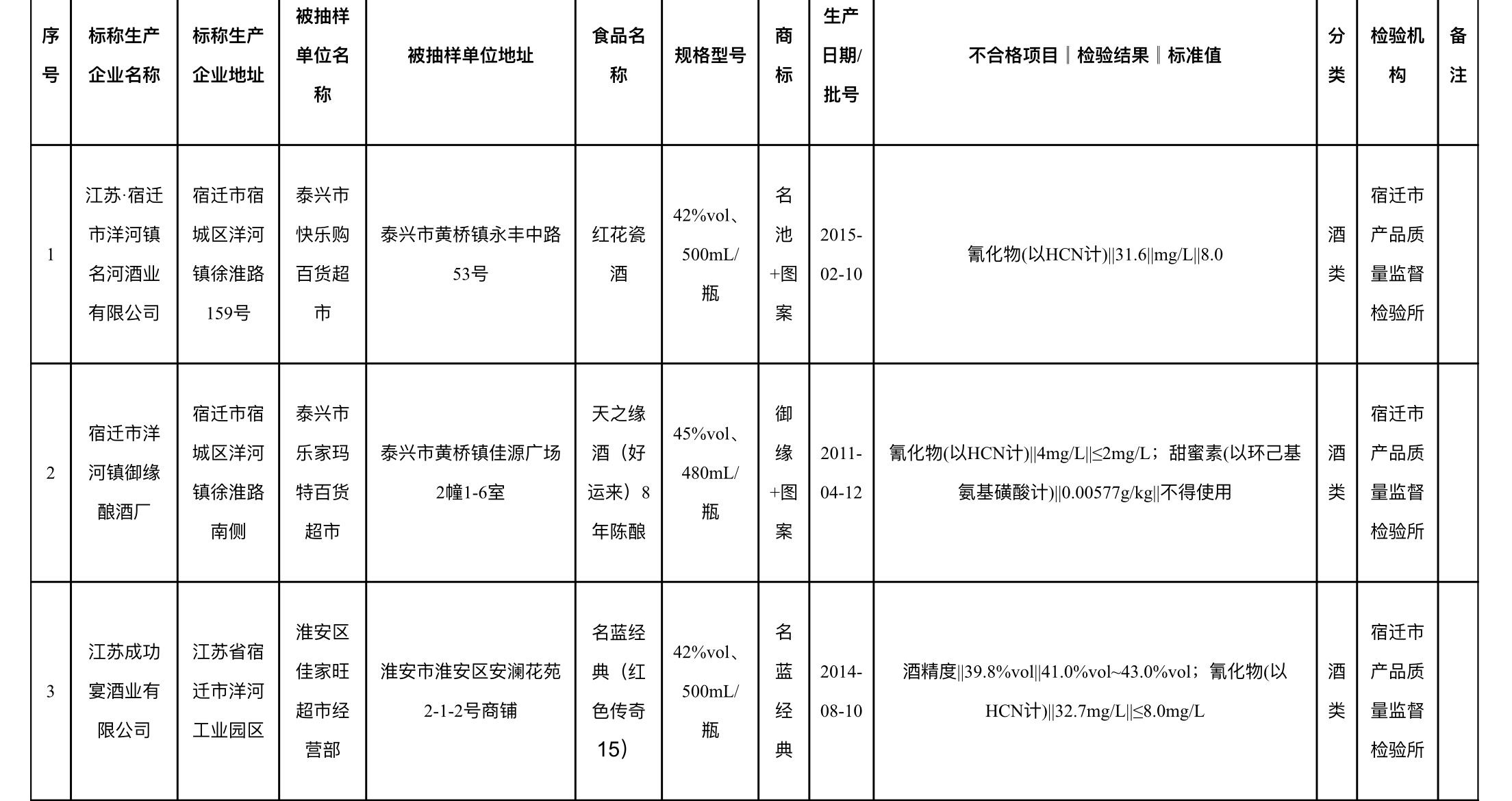 泰州市泰兴市快乐购百货超市销售的标称江苏·宿迁市洋河镇名河酒业有限公司生产的红花瓷酒,氰化物(以HCN计)不符合食品安全国家标准规定。检验机构为宿迁市产品质量监督检验所。