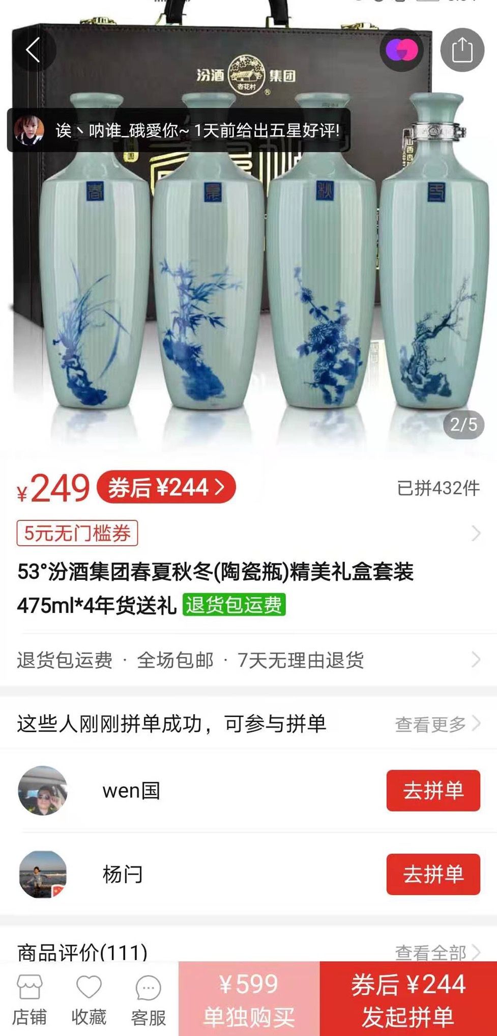 赵梦耀(化名)告诉新京报记者,2020年8月30日,自己共花费299元在于震直播间购买了“53度汾酒集团春夏秋冬手礼套装475ml×4”。同日,赵梦耀发现,这款酒在酒仙网售价也为299元,“还能使用优惠劵”。新京报记者近日再次了解该产品价格,发现在拼多多上“53度汾酒集团春夏秋冬手礼套装475ml×4”售价为249元。