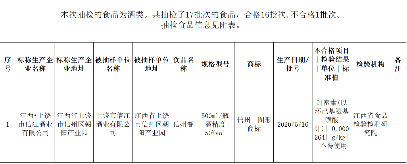 新京报讯(记者 郑明珠)近日,江西省市场监督管理局官网发布2021年第10期食品抽检信息,本次抽检17批次酒类产品,检出1批次甜蜜素不合格。由上饶市信江酒业有限公司销售的,标称江西上饶市信江酒业有限公司生产的信州春,甜蜜素不符合食品安全国家标准规定。检验机构为江西省食品检验检测研究院。