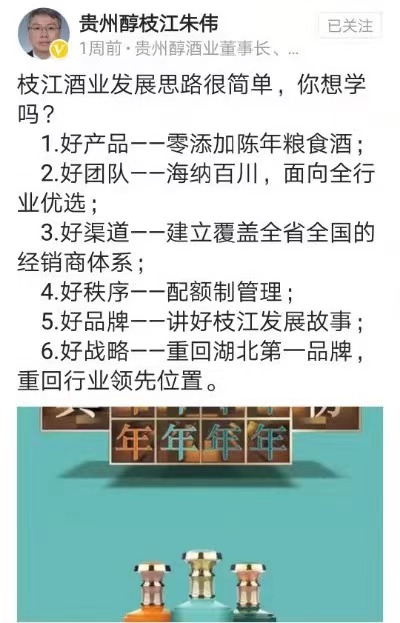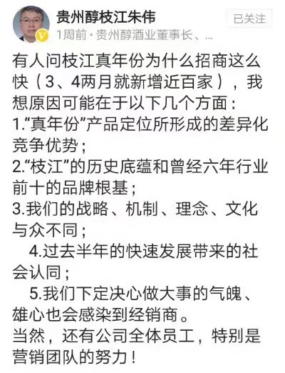 在朱伟的操盘下,老牌名酒贵州醇无论品牌知名度,还是市场业绩、招商情况在开年来均大幅上升。盈利方面,贵州醇今年1-4月份净利润已与去年全年基本持平;招商方面,企业新增经销商147家,累计近400家。