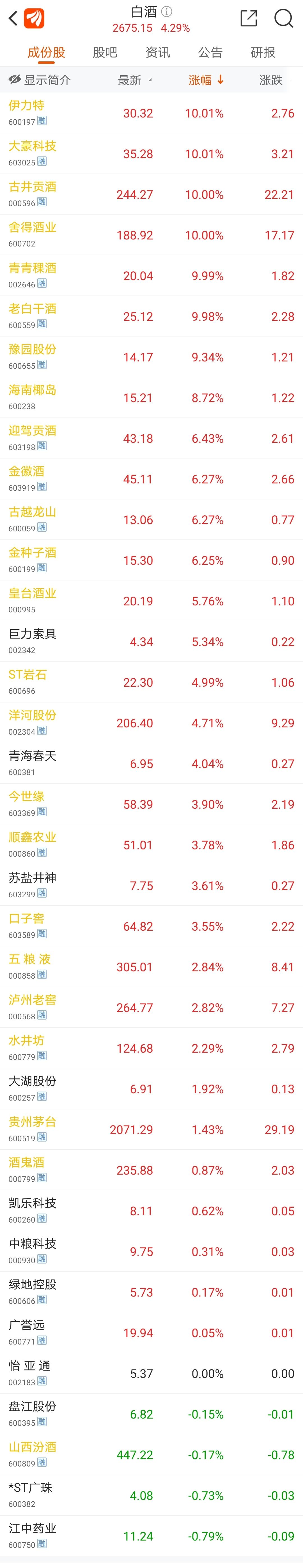 伊力特涨停,报30.32元/股;青青稞酒涨停,报20.04元/股;老白干酒涨停,25.12元/股;古井贡酒涨停,报244.27元/股。