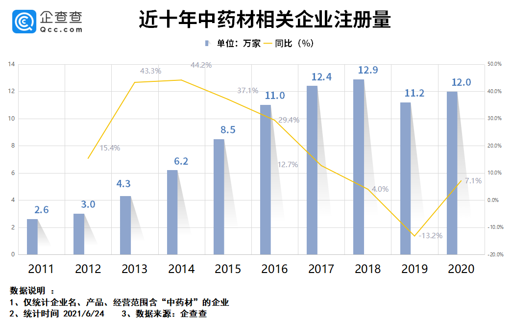 企查查数据显示,从近十年中药材相关企业发展状况来看,企业注册量整体呈增长趋势,2018年是注册量的高峰期,当年注册量为12.9万家;2019年注册量为11.2万家,2020年注册量为12.0万家,同比增长了7.1%。