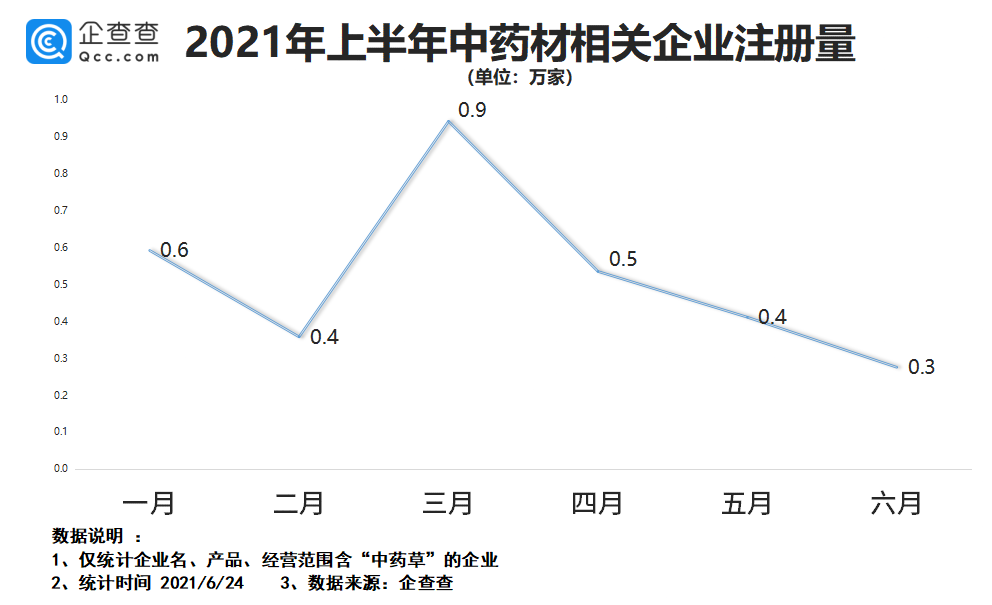 从今年的注册量来看,2021年前六个月,我国中药材企业注册量为3.1万家,同比下跌48.3%。从各月注册量来看,今年一月和三月是注册量较多的月份,分别注册了0.6万家、0.9万家相关企业。