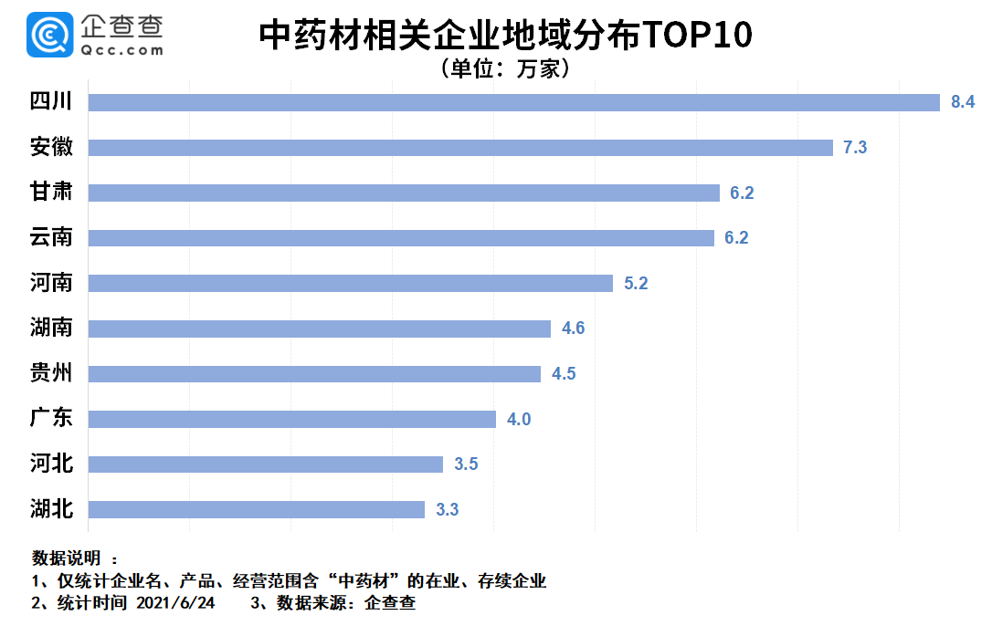 从地域分布来看,企查查数据显示,目前我国现存的中药材相关企业主要分布在四川、安徽、甘肃等省份。其中四川拥有最多的中药材相关企业,共8.4万家排全国第一。安徽排名第二,共7.3万家相关企业;甘肃排名第三,有6.2万家相关企业。