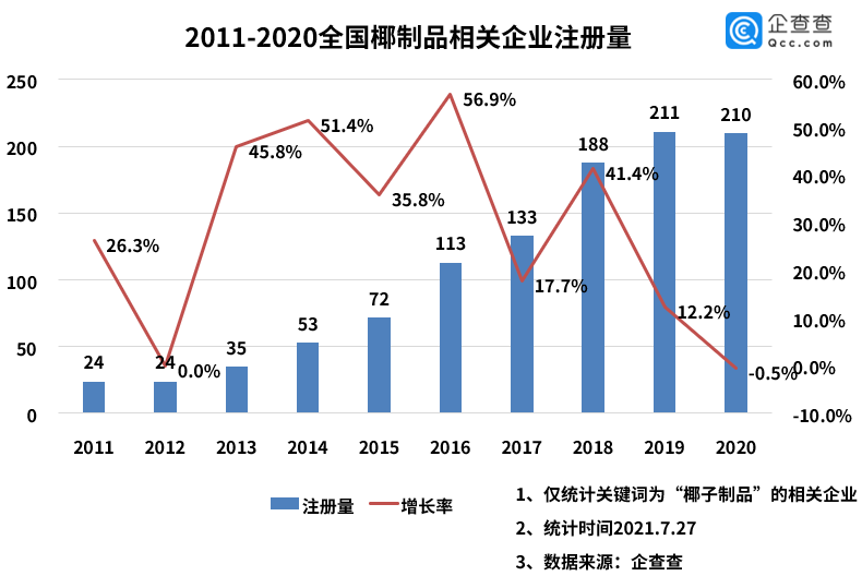 截至7月27日,今年我国共注册椰子制品相关企业119家,与去年的同期117家基本持平。过去10年,行业基本处于缓慢增长的趋势。