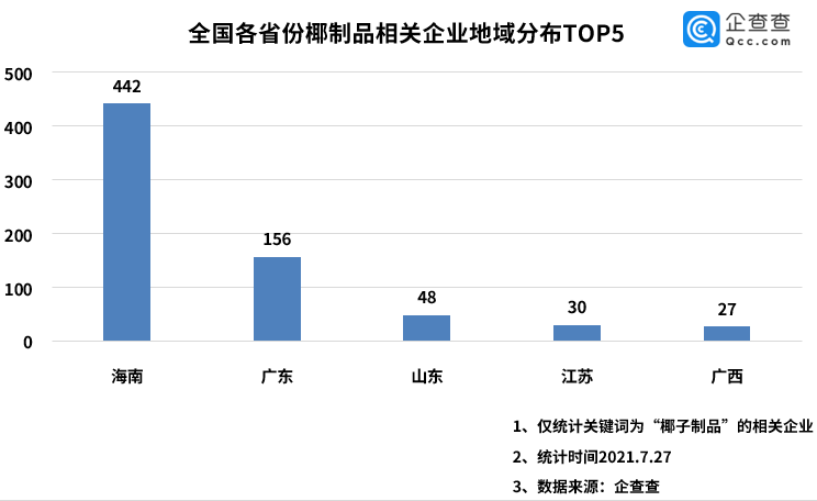 企查查数据显示,目前我国共注册“椰制品”相关企业1421家,其中状态为存续、在业的仅有1000家。从注册量来看,2019年达到最高,为211家,过去五年新增量均在100家以上。从现存企业地域分布来看,海南省以442家排名第一,占比全国的44.2%,广东、山东分列二三位。