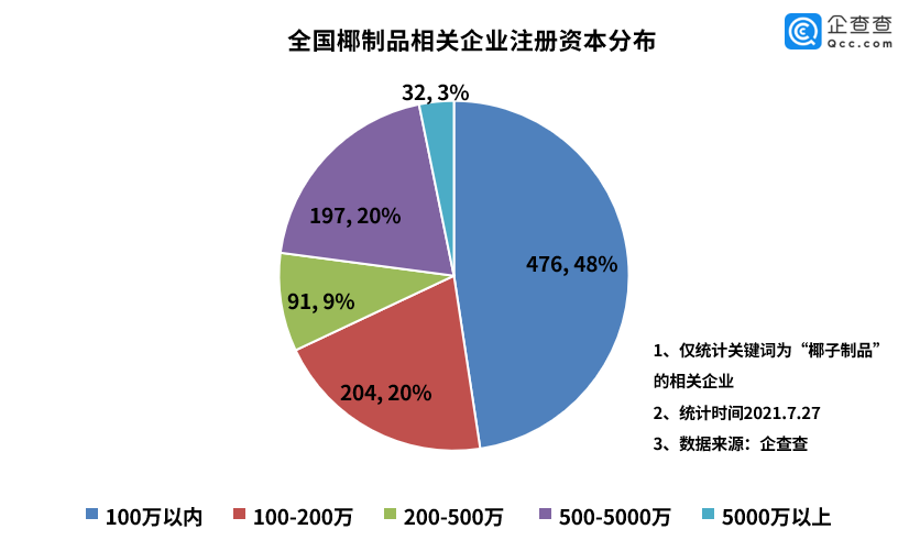 按注册资本来看,有476家企业注册资本在100万元以下,占比48%。注册资本在5000万元以上的有32家,占比3%。