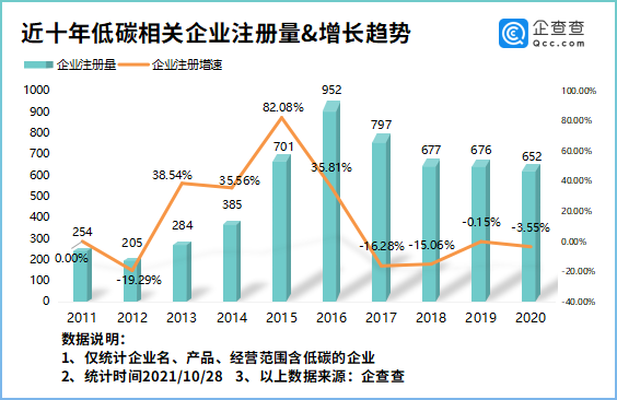 企查查数据显示,我国现存低碳相关企业7645家。2015年我国新增低碳相关企业701家,同比增长82.08%,是近十年增速最快的一年。2016年我国新增低碳相关企业952家,同比增长35.81%,是近十年我国新增低碳企业最多的一年。2019年新增低碳相关企业676家,同比减少0.15%。2020年新增652家低碳企业,同比减少3.55%。
