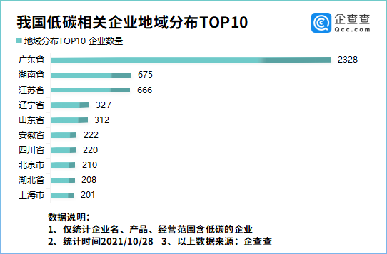 企查查数据显示,从区域分布来看,广东以2328家低碳相关企业排名第一,湖南省、江苏省分别有675家、666家低碳企业,排在第二、三名。此后依次为辽宁省、山东省、安徽省等。