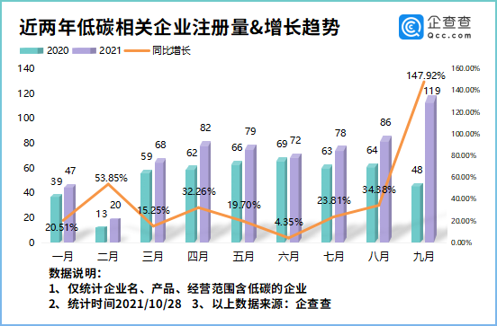 企查查数据显示,2021年前9月,我国新增低碳相关企业651家,同比增长34.78%。最近的9月,我国新增低碳相关企业119家,同比增长147.92%,是今年前9月中新增最多的月份。8月新增低碳相关企业86家,同比增长34.38%。