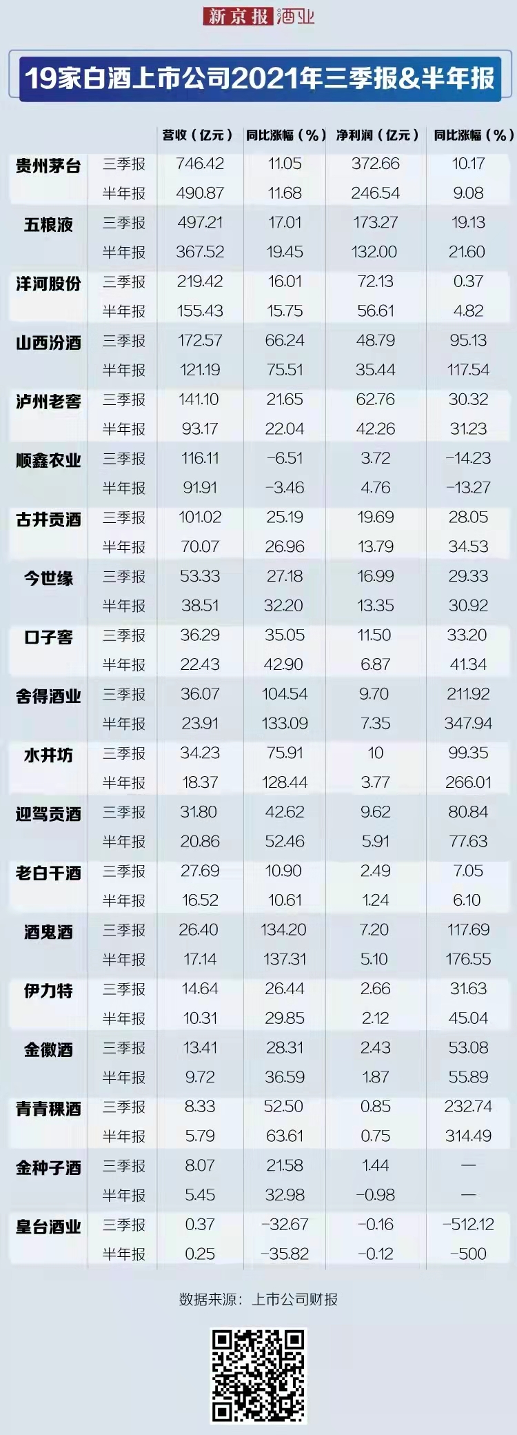 以前三季度数据为例。贵州茅台前三季度实现营业收入746.42亿元,净利润实现372.66亿元;五粮液前三季度实现营收497.21亿元,净利润实现173.27亿元;洋河股份实现营收219.42亿元,净利润实现72.13亿元。仅这三家企业,其净利润之和,已经占据了19家上市白酒企业净利润总和的七成以上。