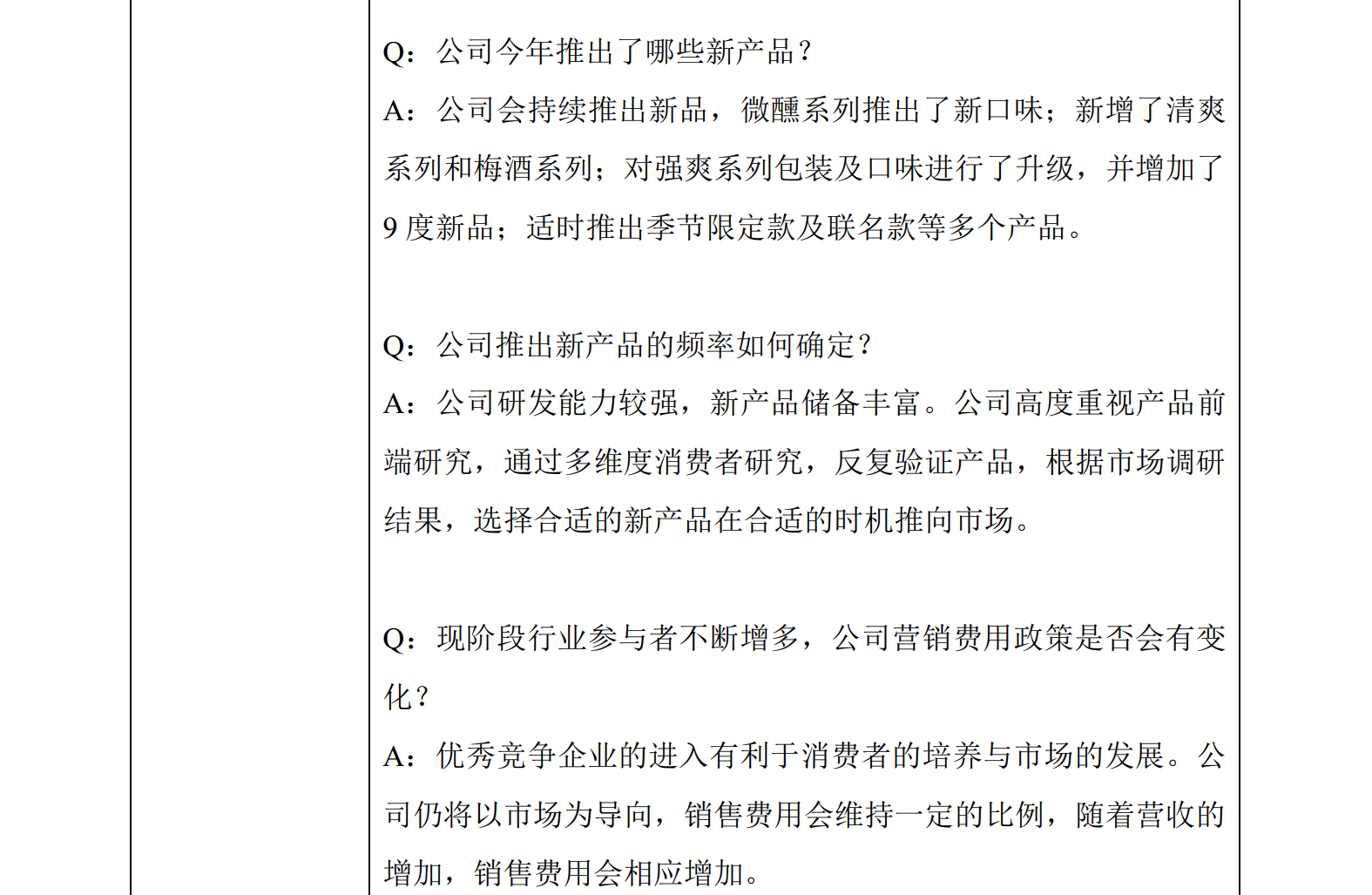近年来,低度酒赛道逐渐拥挤。有投资者提问称,“现阶段行业参与者不断增多,公司营销费用政策是否会有变化?”百润股份回复表示,优秀竞争企业的进入有利于消费者的培养与市场的发展。公司仍将以市场为导向,销售费用会维持一定的比例,随着营收的增加,销售费用会相应增加。