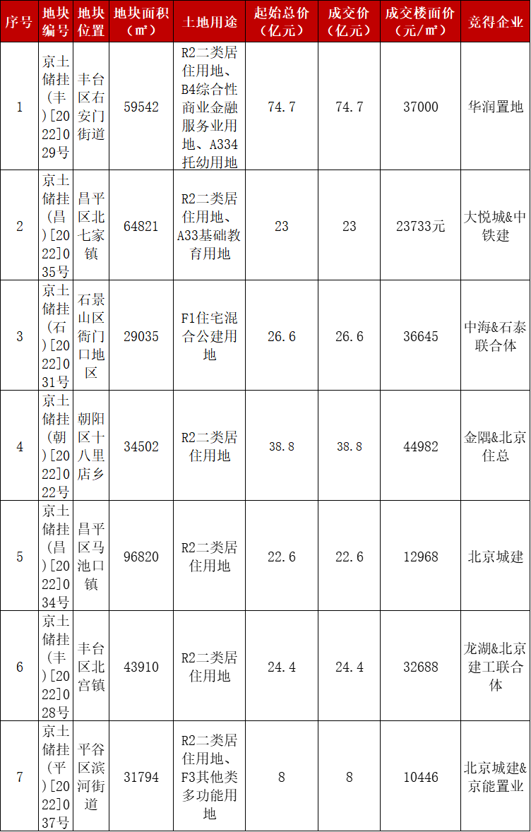 从成交结果来看,底价成交的7宗地块分别由华润置地、城建、住总+金隅联合体、大悦城+铁建联合体、龙湖+建工联合体、中海+石泰联合体、京能+城建联合体斩获。