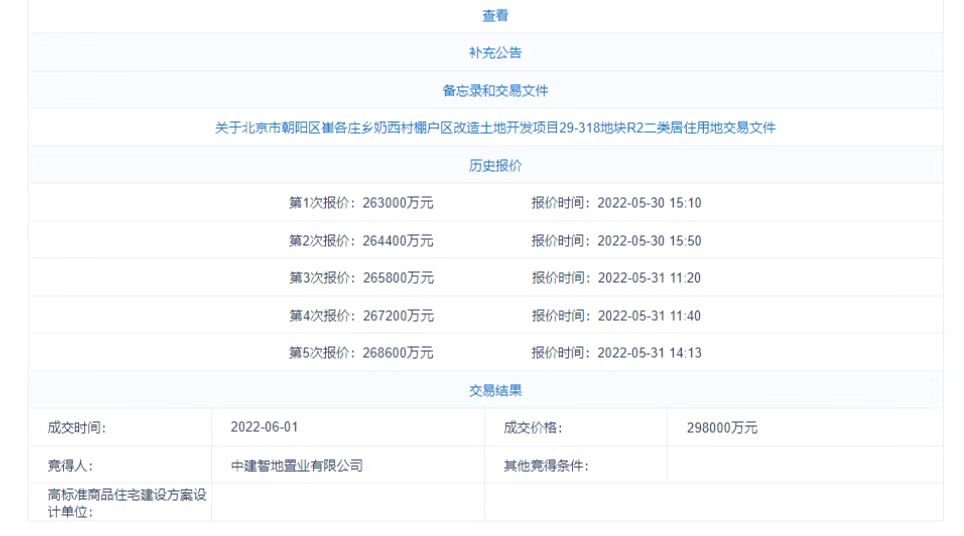 新京报讯 (记者饶舒玮)6月1日,北京第二批集中供地进入现场竞价环节。在上午场中,中建智地以约29.8亿元竞得朝阳区崔各庄乡奶西村棚户区改造土地开发项目29-318地块,溢价率约13.31%。