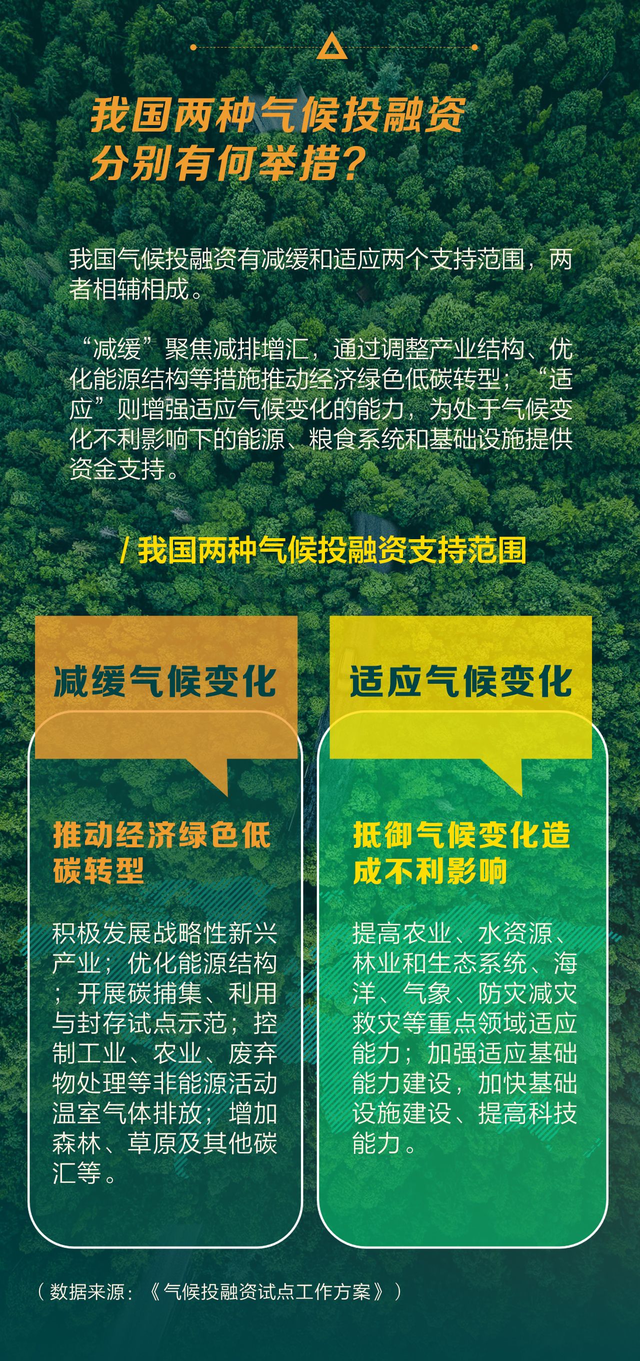 “减缓”聚焦减排增汇,通过调整产业结构、优化能源结构等措施推动经济绿色低碳转型;“适应”则增强适应气候变化的能力,为处于气候变化不利影响下的能源、粮食系统和基础设施提供资金支持。