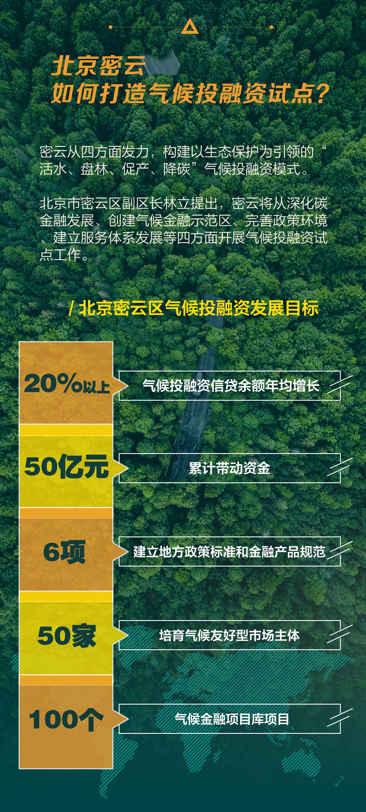 密云要建一个什么样的气候投融资试点?林立表示,预计密云气候投融资信贷余额年均增长20%以上,累计带动资金50亿元,培育气候友好型市场主体将达到50家,形成气候金融项目库项目100个。