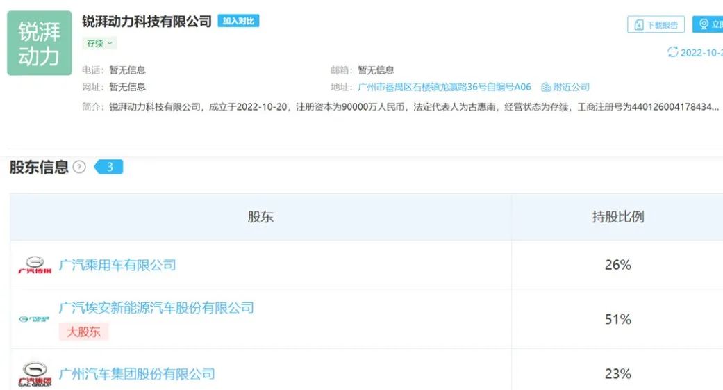 新京报贝壳财经讯(记者白昊天)10月25日,贝壳财经记者从广汽埃安官方了解到,由广汽集团、广汽埃安、广汽乘用车联合投资,并由广汽埃安控股的锐湃动力科技有限公司已正式注册成立,注册资本9亿元人民币。