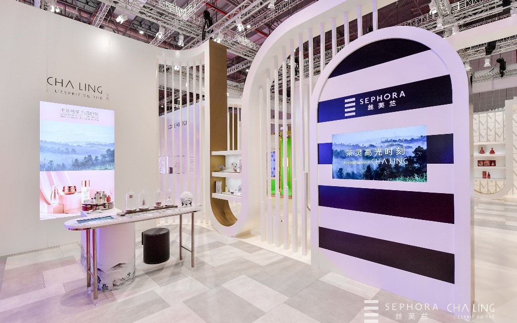 除资生堂外,作为LVMH(路威酩轩)集团的重要成员之一,彩妆零售品牌丝芙兰携手护肤品牌茶灵(CHA LING)再度亮相进博会。丝芙兰展台位于集团展区的主要入口处,品牌经典的黑白条纹元素设计辅以带有云南茶林画面的展柜,将西方简约美学与东方古典优雅相融合。