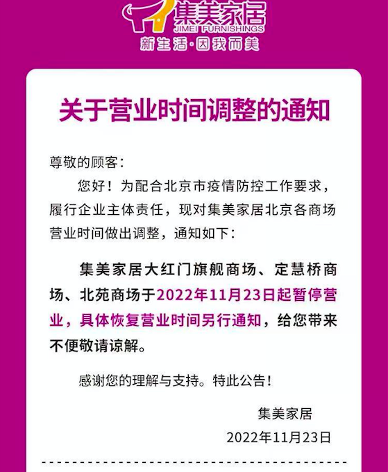 首页 > 商业 集美家居大红门旗舰商场、定慧桥商场、北苑商场23日起暂停营业 2022-11-23 12:12:04 编辑:王琳 新京报讯 11月23日,集美家居微信公众号发布营业时间调整通知,集美家居大红门旗舰商场、定慧桥商场、北苑商场于11月23日起暂停营业,具体恢复营业时间另行通知。集美家居微信公众号截图编辑 王琳 点赞 +1 微信 我要评论 登录 相关推荐 21岁的老牌家居卖场悄然蜕变,还有多少惊喜是消费者不知道的? 集美家居,大红门,店庆 行业观 9774 购物返现、一线品牌打折,集美家居大红门旗舰商场迎21周年店庆 集美,店庆,打折 产经速递 国庆中秋双节同至,集美家居线上线下多元联动让利惠民 装修,集美家居 产经速递 14284 补贴、满额赠礼、联合一线品牌,集美家居线上线下同步优惠促销 集美家居,优惠 产经速递 9818 年中焕新直补周启动,集美家居“618家居焕新节”持续发力 集美家居,618 产经速递 热点 货足价稳,风雪无阻:首衡集团托稳京津冀冬季“菜篮子” 1天前 人民币兑美元汇率创逾14个月新高,短期有望再次逼近7 16小时前 解码未来产业|万亿产业南北联动 透视北京医药健康产业创新密码 16小时前 “居家带货日入千元”,短视频带货“导师”设局专坑宝妈 21小时前 中国农业科技国际交流协会食物营养与大健康分会成立 1天前 最新 网红减肥产品违规宣传未停,一店铺将停业丨消费质量年终回访⑩ 1分钟前 朱苏荣出任中互金新任会长 20分钟前 晋商银行旗下晋商消费金融成为被执行人 20分钟前 多家银行再度提示黄金风险!贵金属交易还能不能投资? 8小时前 “爱养牛每日酸奶”生产方被吊销生产许可证|消费质量年终回访⑨ 11小时前 长安汽车:随着L3规模扩大 未来可以下沉到15万级别车型 12小时前