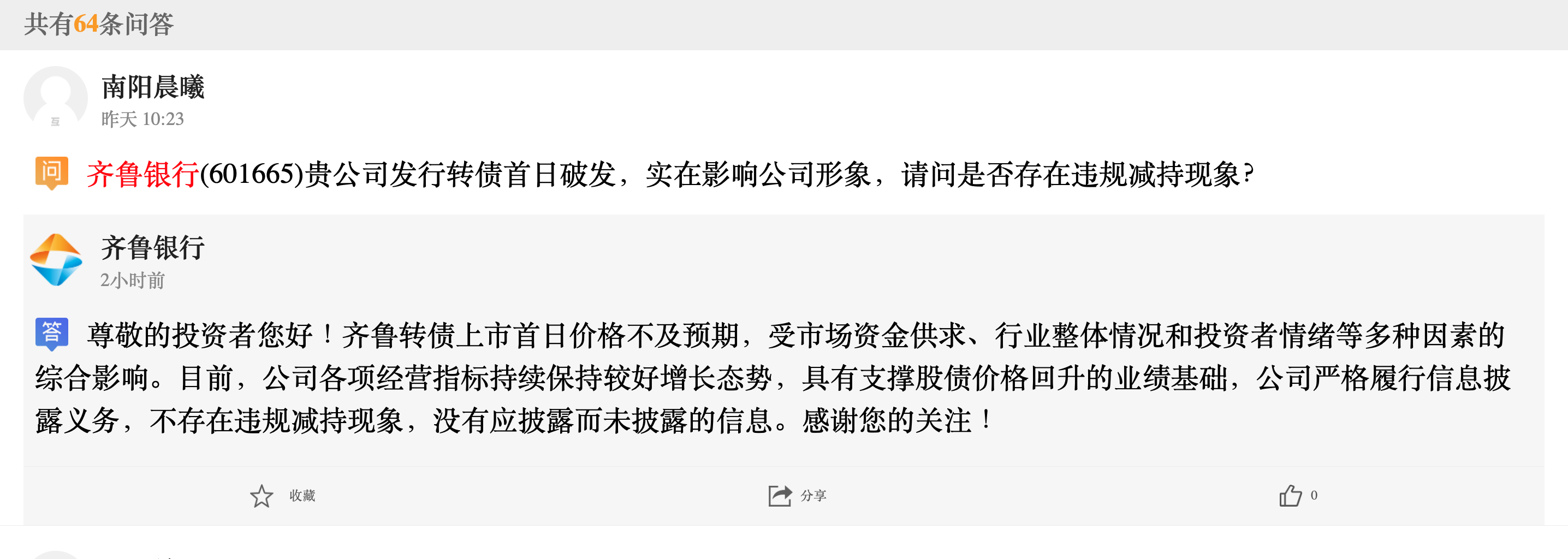 在投资者关系平台上,有投资者提出质疑称,齐鲁银行发行转债首日破发,是否存在违规减持现象?对此,齐鲁银行在该平台作出回应表示,齐鲁转债上市首日价格不及预期,受市场资金供求、行业整体情况和投资者情绪等多种因素的综合影响。目前,齐鲁银行各项经营指标持续保持较好增长态势,具有支撑股债价格回升的业绩基础,该行严格履行信息披露义务,不存在违规减持现象,没有应披露而未披露的信息。