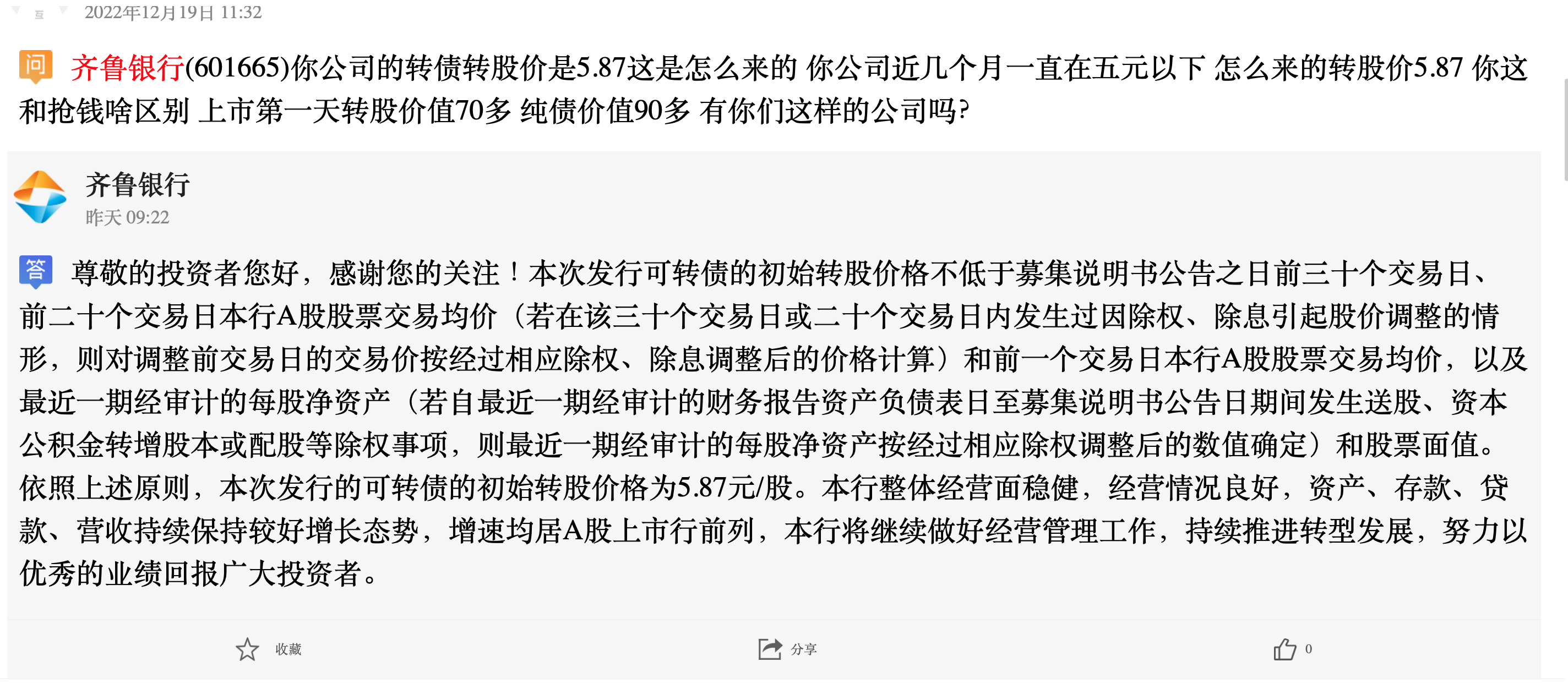 而对于齐鲁银行的初始转股价格,亦有投资者提出质疑。